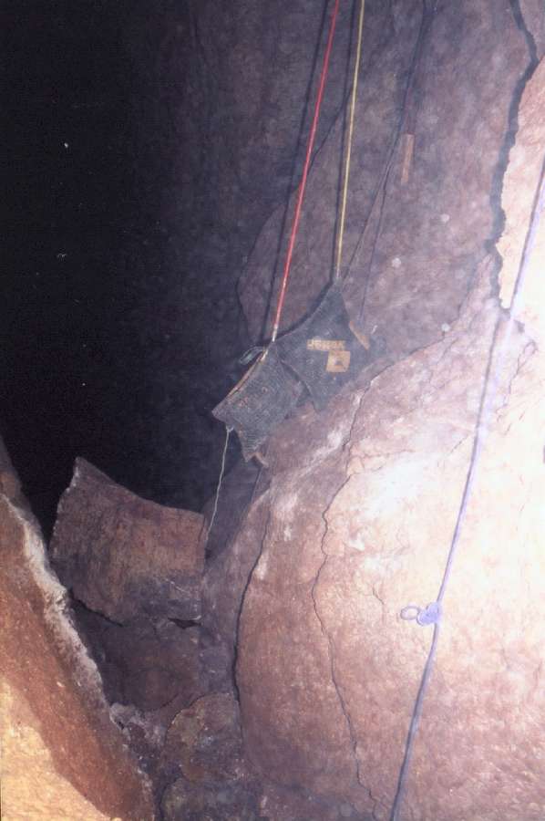 Bezprostředně po pádu, nad shozeným kamenem visí nafouklé kevlarové vaky