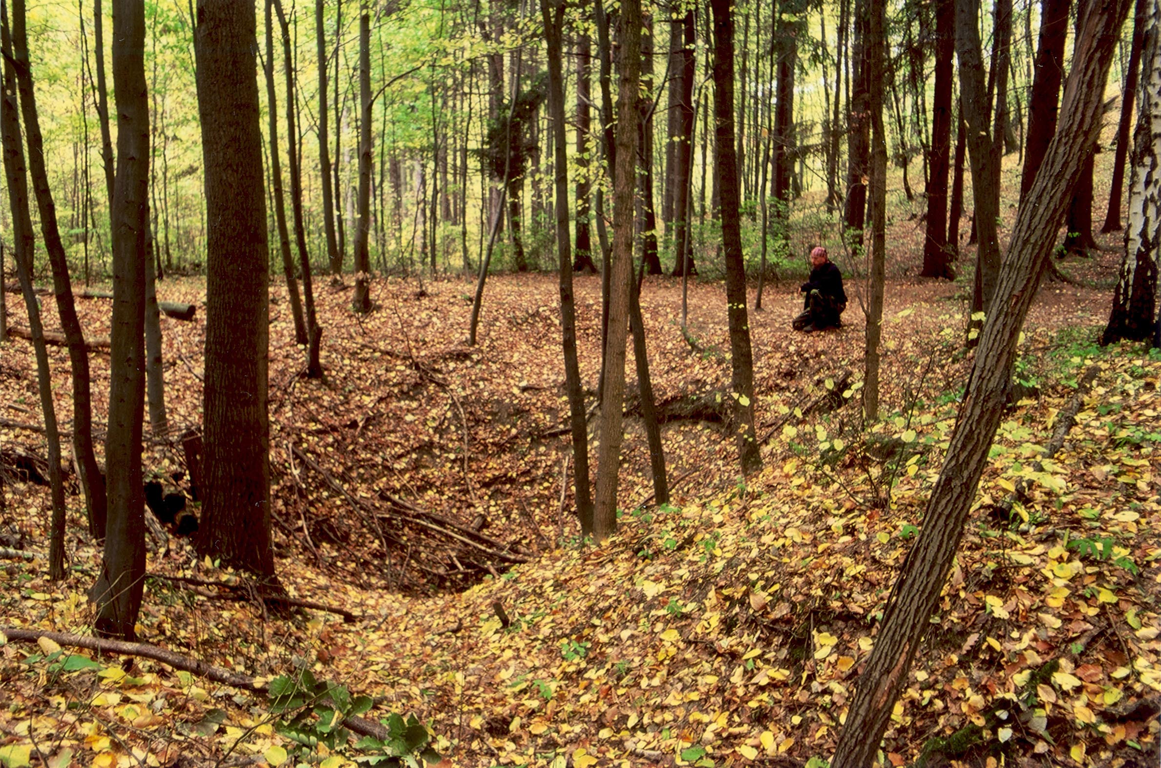 Vlčí jámy, závrt 105; leží na křižovatce červené a zelené turistické značky a za deště pěkně hltá vodu